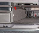 The protective mat for the rear cargo area of the VW T7 California Beach Camper model also features a hook-and-loop fastener at the front for a perfect connection to the velour carpet in the passenger compartment. The protective mat can be used with or without the velour carpet in the passenger compartment.