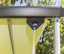 The awning guy wire is inserted into the piping rail of the awning front section and secured to the ground with pegs.